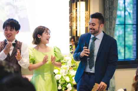 演出ではスマホでフォトを投影できる機材を使ってベストスマイル賞の募集と発表を行いました。皆様それぞれが撮った素敵なフォトが画面に投影されていくと会場内に笑顔が溢れ素敵な盛り上がりを見せました。受賞した皆様からも新郎新婦にメッセージをいただき全員笑顔のハートフルなシーンとなりました。さらに演出の最後には新郎様からサプライズ演出もあり感動的なシーンに繋げることもできました。