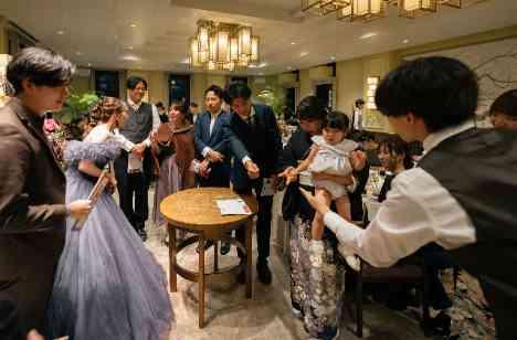ありがたいことにたくさんの家族が集まってくださり子供たちの参加も10名を超えるほどでした。みんなが盛り上がる演出を考えたときにお二人に関するクイズ大会にしようとなりました。手作りしたプロフィールブックにゲームの内容やビンゴのマスを記載して待合からワクワクできるように工夫しました。ゲストみんながクイズの回答に盛り上がりエピソードビンゴが揃うたびに大いに盛り上がる瞬間が生まれました。