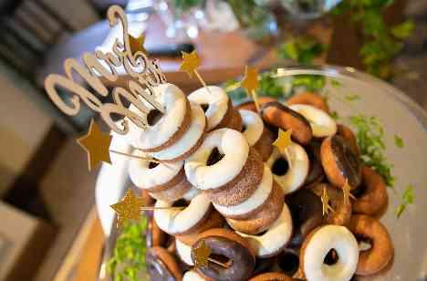 手作りのペーパー類やたくさんのフォトスタンドを飾ったバンケット。新婦はひと目惚れしたウエディングドレスのチュールを自分らしくアレンジ。普段からドーナツ屋巡りを楽しむふたりらしく、ウエディングケーキにも個性を発揮。星のオブジェもプラスした、可愛らしさと珍しさが大好評のドーナツタワーは写真映えも抜群!
