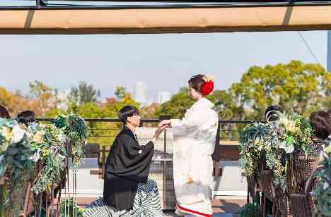開放的なガーデンチャペルで挙式を行ないました。見学時から「大阪城をバックに和装が着たい」と決めていましたが、和のお城×大阪城がすごいインパクトあり親族・友人に見届けられる中、私たちらしく1日がスタートできました!