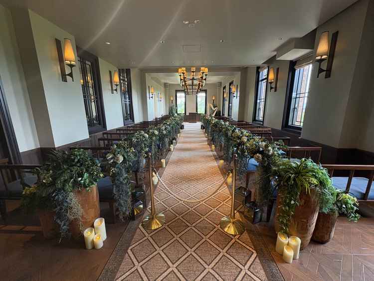 式場にはハープが置かれており当日は生演奏をしてもらえることや、窓からは緑が見えるようになっており、和やかな雰囲気で式ができそうだと思った