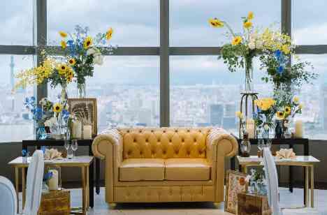 新郎新婦が座るメインテーブルはカジュアル×アットホーム感を存分に引き出せるソファーコーディネートに! 装花も縦、横へと動きの出る装飾になるため豪華な印象にもなりました。ソファーにすることでゲストも近寄りやすくアットホームパーティにもってこい♪ 花材は夏らしさを感じられるヒマワリをメインに黄色多めにしました♡