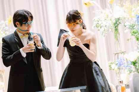 盛り上がった演出のひとつ『すっぱいジュース早飲み対決』!!ゲストの皆さんには新郎新婦どちらが先に飲み終わるかを事前に予想し投票してもらっていました。 おもしろメガネをかけて体を張る新郎新婦の姿にゲストも大盛り上がり!応援の声が交け合いました。 見事、予想を的中させたゲストにはプレゼントを用意。ふたりの人柄が表れたユニークな演出です。