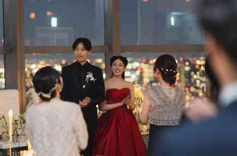 パーティ中に空は夜景へと変化…。 赤のドレスもより華やかに魅せ、まるで韓国ドラマに出てくるようなパーティを演出できました。 自分たちのテーマに沿わせたい思いも叶えられ、さらに遠方から来てくださったゲストに“わざわざ東京まで来てよかった”とそんな風に思っていただける景色をプレゼントできたと思います。 本当にドラマティックな印象に残るウェディングでした。