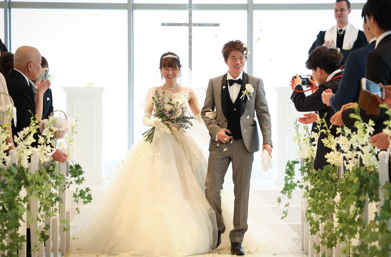 当日は雨予報でしたがおふたり様の挙式時間はなんとか天候がもち 、全面ガラス張りの窓からは姫路城が見え、青空を感じながらゲストに祝福されながらの心温まる挙式となりました。