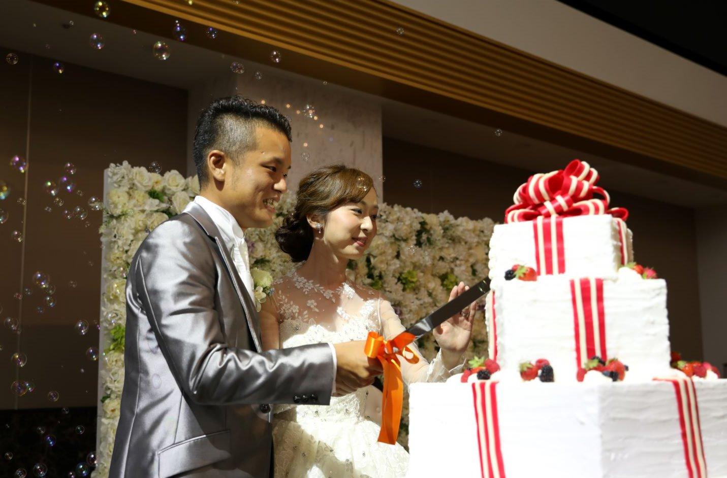 新婦様がこだわったウエディングケーキは特別に作られたデザイン☆3段で高さもありプレゼントボックスのようなケーキ♪ ケーキ入刀の際、後ろからバブルシャワーをやらせていただき、 お写真映えもGOOD☆