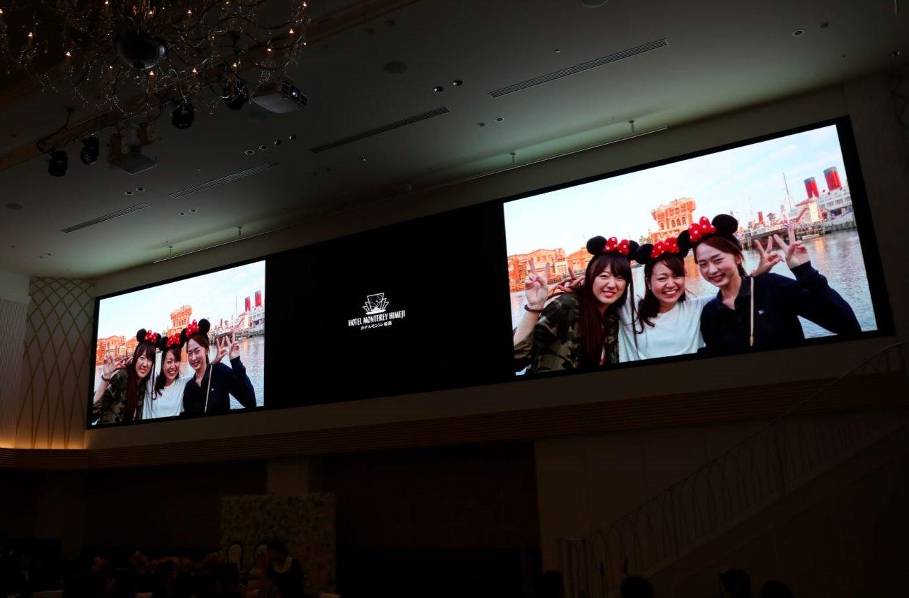 おふたり様がお選びくださった会場は横16mもある巨大スクリーンがある会場。 おふたり様がご自作された映像関係はもちろんご友人様がつくられたサプライズ映像も感動が倍増☆ ご人数様が100名ほどいらっしゃいましたが親御様からのお席でもしっかりと御覧頂くことができました。 モントレオリジナルのフプロジェクションマッピングもご注文頂き、お色直し入場の際も大盛り上がり♪