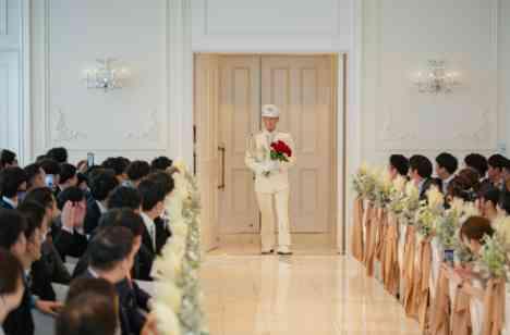 結婚式は自由度の高い人前式を選ばれました。 沢山の人から愛されるスーパースターである新郎様が この日は大切な大切なゲストの皆様に感謝を伝えるべく 赤いバラを手渡しされながらのご入場! スーパースターが少し緊張する貴重なお姿も ゲストの皆さんにとっても思い出に。 花嫁さまの入場と共に 会場内の雰囲気もガラッと変わり まさに笑いあり、涙ありの結婚式に。