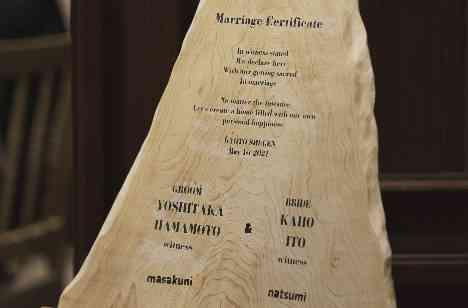 SNSで見た時から希望されていた木の結婚証明書!ゲストに見たことが無い!と驚かれるものを作りたかったとのことで、気に文字をプリントし、承認の欄はステンシルで手作りされました。また、写真映えするようにと金色のコンフェッティもご準備していただき、お写真にもしっかり残していただくことが出来ました!ゲストの方々もお二人の期待通り驚かれており、お二人もとても喜んでいました!