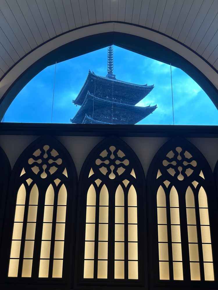 京都らしい和風なスペースと、新しくてモダンな披露宴会場どちらも楽しめるのがいいと思いました。五重塔が見えるチャペルはとてもすてきでした。