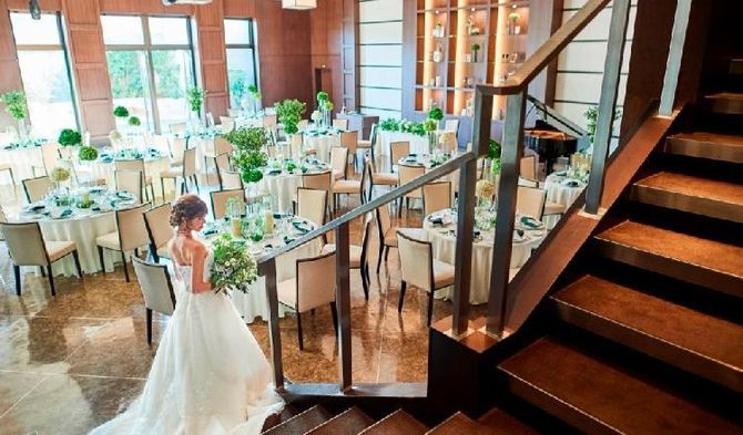 センティール・ラ・セゾン岐阜のダイニングルームは開放感溢れる大きな窓と天井高の高さが特徴。 階段からの入場もでき、ゲストのおもてなしと共に特別感を感じることもできる。
