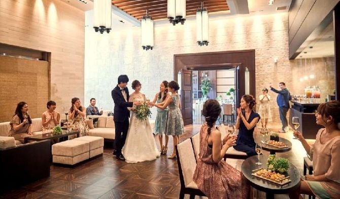 ロビーではゲストの皆さんをお迎えして、美味しいお酒や北海道の食材を使ってフィンガーフードを楽しんで頂ける空間に。 貸切空間だからこそ、自由な飾り付けをしてお二人を表現することができる。