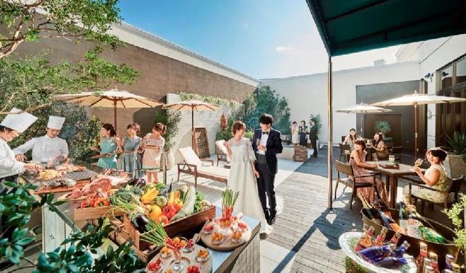 ダイニングルームと一続きになったガーデンテラスは風を感じる特等席。 ゲストに心地よいもうひとつの席を。 またガーデンを使ったデザートビュッフェや、岐阜と北海道の食材をかけ合わせたバーベキューの演出も可能。