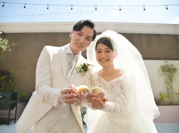 かしこまった感じではなく楽しくしたいというおふたりのご希望通り、ゲストもリラックスした雰囲気に。 そこに登場したのはリングを運ぶ(リングと一緒に運ばれる)ひよこたち。これにはゲストもにっこり。 ゲストからの声がすぐに届く温かな距離感でフラワーシャワーの祝福をうけます。 そしてガーデンに出てブーケプルズ。コスメブーケなら女性ゲストの誰にあたっても喜ばれます。