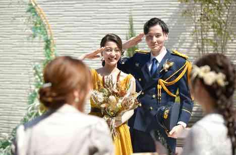 ナチュラルなひよこカラーのたっぷりとしたお花に包まれて。 この日のテーマカラーはひよこの黄色、新婦が大好きなお色です。 ゲストに動画(なんとそこにもひよこが出演)を見てもらっている間にお色直しです。 新郎は職場の制服、新婦はマスタードイエローのドレスで階段から登場。 新郎の制服と新婦のドレスがマッチして、素敵なペアコーディネートになりました。