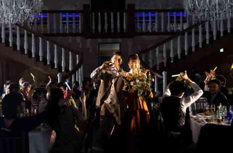 挙式が結び、ここからは楽しむのみです!! こだわったオリジナルドリンクと一緒に写真を撮ったり、バルーンイベントをゲストと楽しみます。 そして披露宴スタート! ご新婦様はアップスタイルからダウンスタイルへイメージチェンジされました。 再入場はお二人が好きな「アイドル/YOASOBI」のBGMで! ゲストにはカラフルなペンライトを振ってもらい大盛り上がり! 「まさに最強で無敵のアイドル」♪