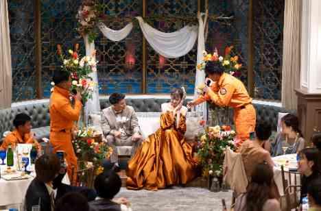 【ウェディングケーキ】 特大スプーンを使ってご新婦様からご新郎様へ愛のファーストバイトです♪ またお二人からゲストへ幸せのおすそわけもされました 【余興】 ご新郎様の職場の方からご余興のプレゼントです! 「愛の救助隊」が現場に駆けつけてくれました♪ 最後にはサプライズでご新婦様に花束のプレゼントです