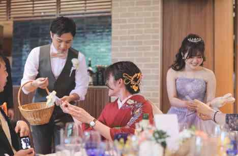 直接感謝の気持ちを伝えたいおふたりは、お色直し入場後に受付で配ったメッセージカードを回収して おひとりおひとりと会話を楽しんでいらっしゃいました。 メインイベントの『ベストオブオレンジ』は、我こそはオレンジを身に着けている!と自信があるゲストを自主的にお呼びして、 その中から1名にプレゼント贈呈。