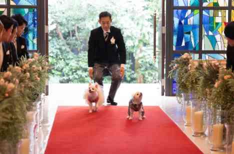 おふたりの入場は、ジャケットセレモニー・ベールダウンを行い、親御様に身支度を整えて頂き、決意を新たにご入場頂きました。 お式の中では、お二人のご家族である、愛犬のころた君とこはるちゃんに リングドックとして、お手伝いを頂きました。 無事に大切な指輪を届けてくれて、とても素敵なかわいいシーンとなりました。