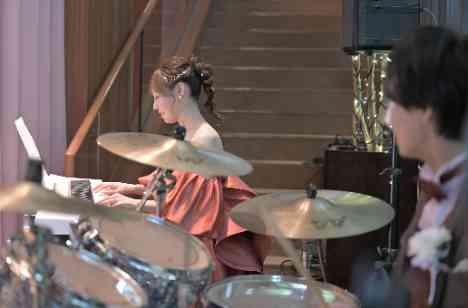 再入場前、ドキドキしながらスタンバイしました。 映像が終わると共に、おふたりの演奏が始まりカーテンがオープンしていきます。 曲が進むにつれて、お母様のクラリネットが加わりました。 そして、ついにお父様のサックスも登場します。 このころには会場全体が一体となる大盛り上がりの再入場となりました。
