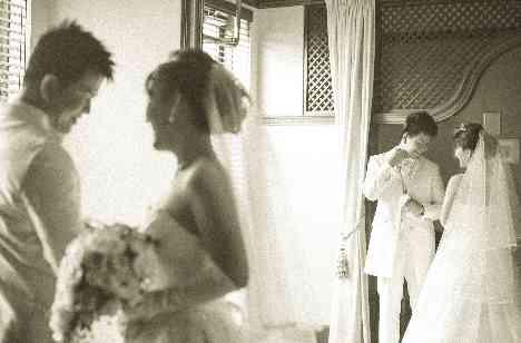 結婚式当日、来館前にご入籍をされたおふたり。 新しい苗字にワクワクされながらお支度が始まりました。 長い髪を結い、リップやチーク、最後にティアラをのせてお支度が完成。 挙式入場前に新婦様はお母様へ「いってきます」、お母様は娘へ「いってらっしゃい」と優しい笑顔でお言葉を交わすおふたりがとても印象的でした。 そしてご新婦様はお母様からお父様へ、お父様から新郎様へと導かれてご入場されました。