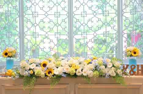 夏っぽく向日葵や貝殻が装飾しており、爽やかな会場装花となりました。 またウェディングドレスのブーケは沢山のトルコキキョウとピンクのバラをアクセントにして。 お色直しではリースブーケをお持ちになりました。 「永遠」や「幸福」を意味するリースブーケは新婦様の優しい雰囲気にもぴったり合っておりました。