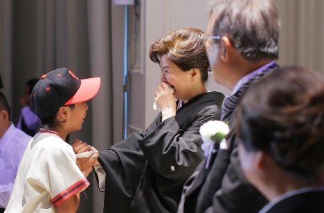 メモリプレイとは新婦お手紙の直前にいきなり子役が登場し、新郎新婦様の幼少期の思い出をその場で【再現】するサプライズ演出。 当時新郎が着ていたユニフォームや、当時を思い出すようなしぐさ、親御様も最初はとても驚かれた表情でしたが、徐々に昔の思い出が蘇り、会場にいたゲスト・スタッフまでもがおふたりの子供時代にタイムスリップしたような不思議な感覚に包まれました。 新婦様の手紙を読む声に重みを感じました