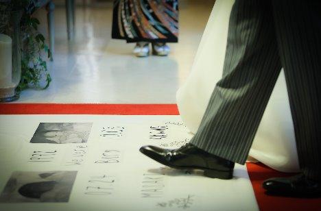 実はバージンロードの上には新婦様の想い出がたっくさん詰まったアイルランナーを手作りで準備をされました。 世界にたったひとつのアイルランナーをみた瞬間、お父様は大変号泣されておりました。 入場したあとは、ゲスト立ち会人のもの行われるローズセレモニーがスタート。 大切な10名のゲストからバラを1本1本想いと一緒に受取り、新郎様の「絶対幸せするよ」というお気持ちを乗せて新婦様へプロポーズ。