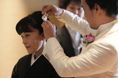 お式の前にご両親と対面した際には、互いの姿を見るなり涙でいっぱいになり、お二人から用意されたお手製のブートニアをお父様、この日の記念に用意したご両家お揃いの簪をお母様へ、それぞれの手で感謝の気持ちを込めお付けしました。 おふたりらしく人前式。 ゲストの皆様からローズを受け取り、感謝の気持ちをお伝えしながら集めた花束はお二人の感謝がいっぱい詰まった花束へとなりお式中お二人を見守るよう飾りました。