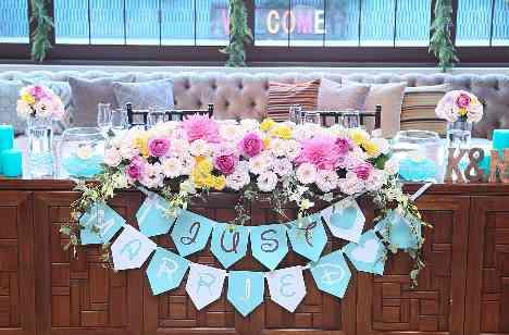 ウエディングケーキはもちろん、卓上の演出のバルーンスパークもライトブルーのバルーンでご用意。 バルーンがはじけると中のカラフルなバルーンが飛び出して来て、ゲストがキャッチ!! 後にあたりのバルーンお持ちの方へは素敵なプレゼントをご用意して、楽しみを倍にして演出しました。