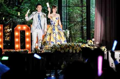 再入場時には、全員にペンライトを持っていただき新郎新婦様をお出迎え! 4色に光るカラフルなペンライトが華やかで、新郎こだわりの好きな音楽にとてもマッチしており、 おふたりとゲストの全員でつくる素敵な空間となりました。