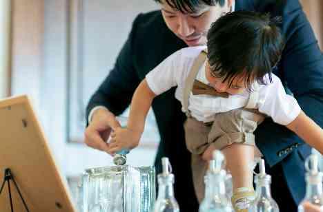 披露宴でのメインイベントは「サンドセレモニー」。 ウェルカムパーティー中に皆さまにご協力頂き、結びの砂を新郎新婦様がご一緒に器へ・・・。 何層にも砂が重なり、素敵なガラスキューブが完成致しました。
