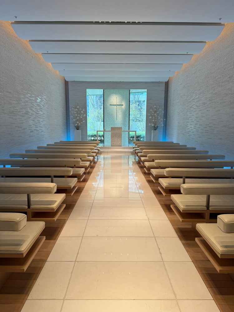 チャペルは夏にぴったりな雰囲気だった。海のイメージがよく伝わった。披露宴会場もどちらも窓があり開放感もあった。