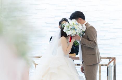 教会式で進めた挙式の前にはおふたりのみで行うファーストミートのお時間がございました。 素敵なドレスをお召しになった新婦様とお顔合わせした際のご新郎様の笑顔がとても素敵でした。 ご新婦様はご友人様にお作りいただいたブーケを持ちご入場されました。 おふたりが前に揃い、皆様のあたたかな祝福の中夫婦の誓いを立てられました。