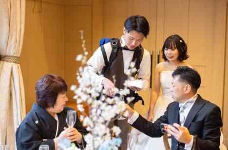 ご披露宴前にはプールで行う演出のドロップ&フライを行いました。 ゲストの皆様にご参加いただき、お写真映えもバッチリな演出でございました。 ご披露宴ではテーブルラウンドでビールサービスを行いました。 お写真を撮影しながら、ゲストの皆様一人一人と仲良くお話しされている様子が印象的な演出でございました。