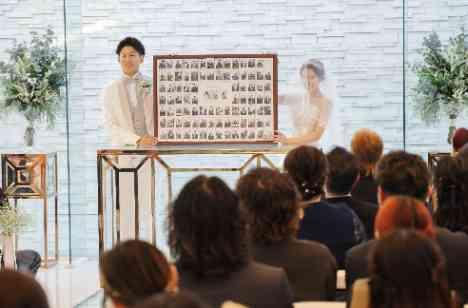 人前式で行ったゲストの承認は、結婚証明書へのサインではなくなんとチェキ📸を使ったボードでした! 受付でゲストの皆さまに写真を撮っていただき、メッセージと共にボードへ入れて承認をしていただきました♡ そして挙式ではおふたりの写真を入れて完成です✨ 90名の笑顔とお祝いのメッセージがたくさん詰まったオリジナルの結婚証明書が出来上がりました♪