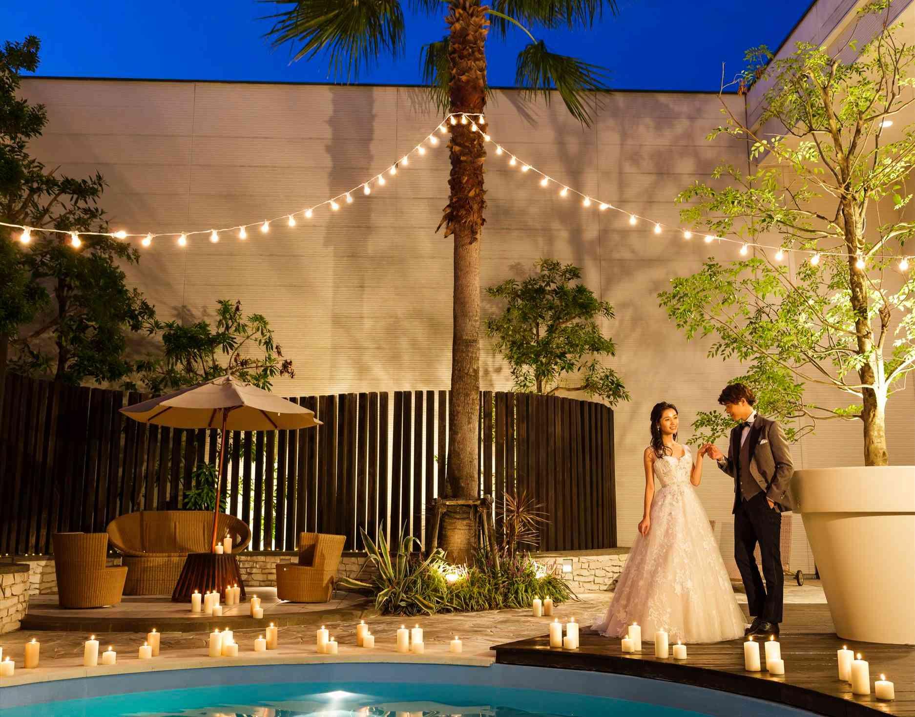 パーティ会場はプール付きガーデンとひと続き。ケーキカットやフォトブース、バルーンリリースなど、ゲストと一緒に楽しむ演出が好評です。外から視線が届かない造りだから非日常空間を思う存分堪能できる!