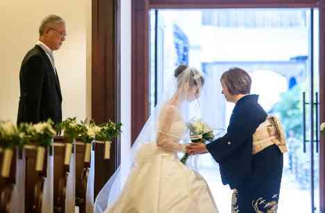 大切にされたのは「家族へのけじめ」。 挙式でのご新婦様入場シーンは、お父様とお母様との3名でのご入場を選ばれました。 お母様からは、最後のお仕度であるベールダウンのセレモニーを皆様の前で行っていただきました。こちらのセレモニー、親御様にとっては子育ての幕を下ろすという意味が込められています。