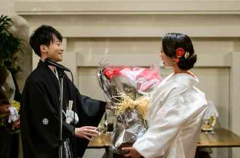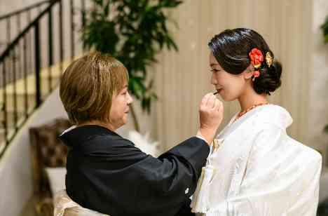 ご披露宴でのお色直しはドレスではなく、和装に。 ここでもしっかりご家族様との時間をとお母様から、ご新婦様の口紅を塗っていただく紅差しの儀を行っていただきました。 古くから魔除けやお祝いの象徴であった紅、「幸せなってね」との想いが込められています。 番傘を持ってのご入場に会場は大盛り上がりでした!
