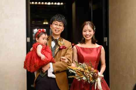 お色直しは真赤なドレスにチェンジされました!ご新郎様も合わせてタキシードチェンジしていただき、 さらにお子様もご新婦様とお揃いの真赤なドレスにお着替えされました。 3人でお色味を合わせてのコーディネートに、ゲストの皆様からも温かな歓声と笑顔が溢れました。 ご披露宴中のお子様の特等席はメインテーブル横のベビーカーに。ゆっくりお休みいただきながら楽しまれました。