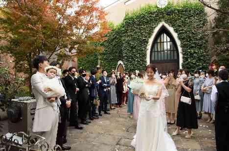 秋深まり、楓が色づくプライベートガーデンではご新婦様の憧れだったブーケトスを行われました。 続いてご新郎様は子孫繁栄を表すブロッコリートスを! キャッチされたご友人様にはブロッコリーを美味しく召し上がっていただけるよう 一緒にマヨネーズのプレゼントもご用意されました。 美しい紅葉の中で全員での集合写真もバッチリ残していただきました。