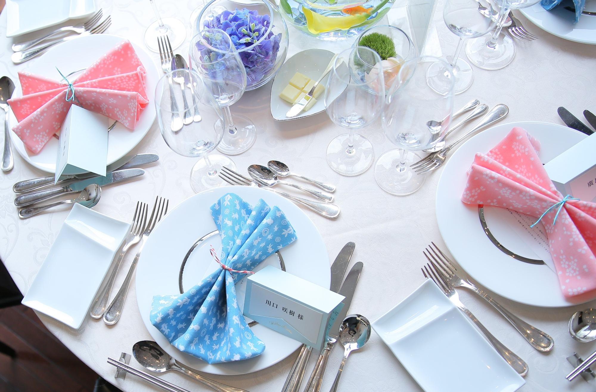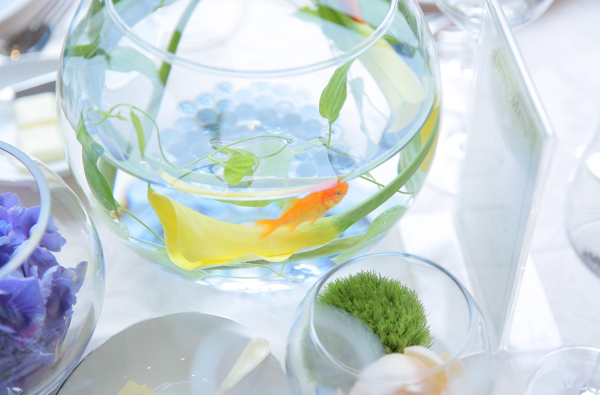 テーブル装花の中に本物の金魚を装飾。夏の涼しさと子供のころの思い出を感じて頂くことわテーマに。ナフキンは金魚の尾ヒレをイメージ。