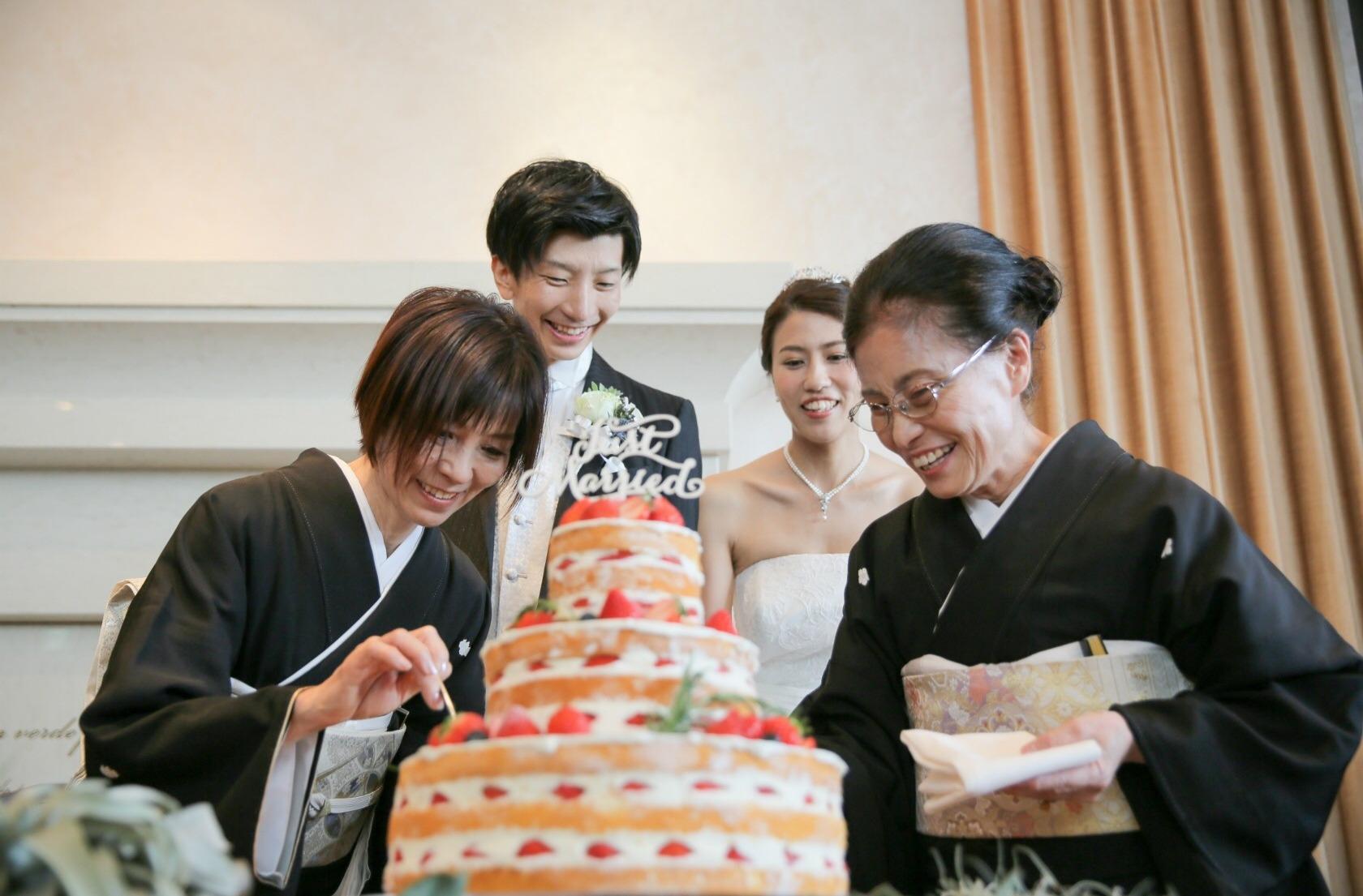ケーキは新郎のこだわりいっぱいの イチゴたっぷりな美味しそうな3段ケーキ ローズマリーや多肉植物でケーキもナチュラルに サンクスバイトはサプライズでお母様をお呼び出し 嬉しそうなお母様方の笑顔が印象的です