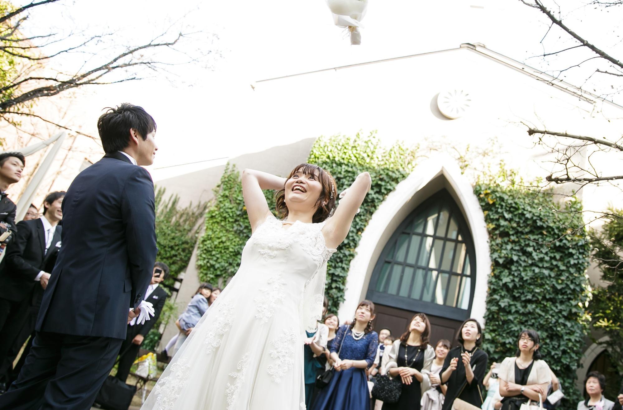 挙式前に牧師先生と流れの確認 緊張の面持ちです 挙式入場の扉が開く瞬間がおふたりのファーストミートの瞬間です フラワーシャワーで皆様に祝福をいただきました 挙式が無事結びほっとした笑顔