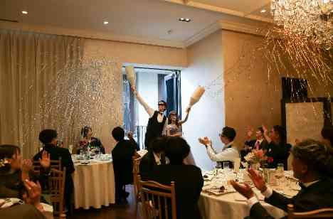 ご披露宴も中盤! お色直し入場ではゲストの皆様にはサプライズで BIGシャンパンクラッカーをしてご入場されました! 会場の照明が落とされおふたりが入場したあとの クラッカーにゲストの皆様も圧巻されておりました! おふたりとゲストの方々の拍手とともに 一体感のあるとても素敵な瞬間でございました♡