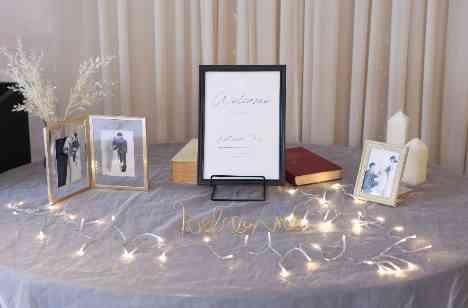 南青山サンタキアラ教会ではご披露宴会場の下スペースに おふたりのご結婚式を彩る、ウェルカムスペースをご用意しております。 お客様のコンセプトに合わせてウェルカムスペースを自由に 飾り付けすることが可能です。 おふたりは前撮りのお写真をモノクロにし、ゴールドの写真立てに入れ、キラキラのライトで囲むというまさに韓国風オシャレな ウェルカムスペースの完成です☆