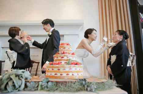 おふたりのお母様にサプライズで前に出てきていただきました^^ 「今までありがとう」の気持ちを大きな一口に込められました! 「あーん♡」の掛け声と共にケーキを口に運ぶお姿はとってもほほえましく 誰もがほっこり笑顔に♪