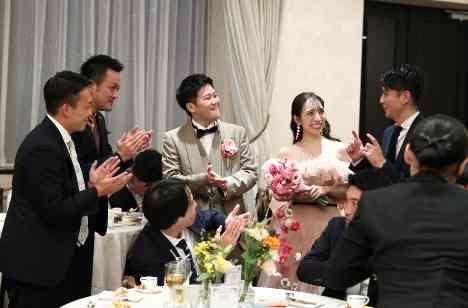 初回のお打ち合わせの際におふたりよりなかなかお互いに時間が合わず結婚式当日に久しぶりに会える友人がほとんどとお話があり。 当日は演出をたくさんするのではなくゲストひとりひとりとの時間をたくさん取れるよう歓談や写真撮影のお時間を設けおふたりがそれぞれのテーブルをまわりました。 各テーブルに行くごとにおふたりやゲストから笑い声が聞こえ素敵な時間となりました。