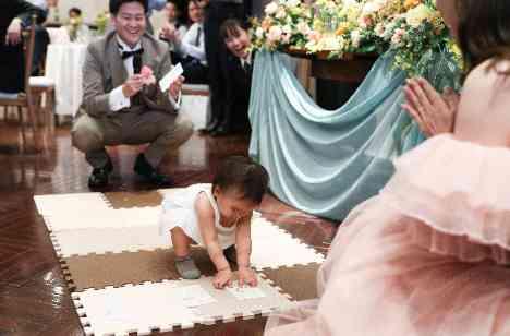 赤ちゃんが1歳の時に赤ちゃんの目の前にさまざまな物を置いて、何を手に取るかで将来を占うもの。 披露宴の前にゲストにはYちゃんが何を選ぶかを選んでいただきました。 おふたりが用意されたカードは「勉強」・「アート」・「運動」・「おしゃれ」 4択カードを並べYちゃんがよーいドンッ Yちゃんが何を取ったのかは秘密 ♡