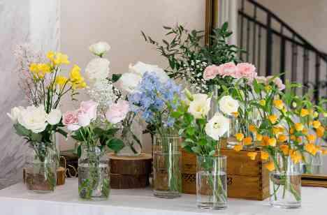 おふたりの挙式4月は草花が豊富な時期という事もあり、春らしいお花を使用して牧場に咲いているような可愛らしいテーブルコーディネートをご提案。 ゲストの皆さまにも楽しんでいただけるよう「フラワービュッフェスタイル」でゲストが好きなお花をピックアップいただきテーブルの上にある小瓶に装飾していただきました。